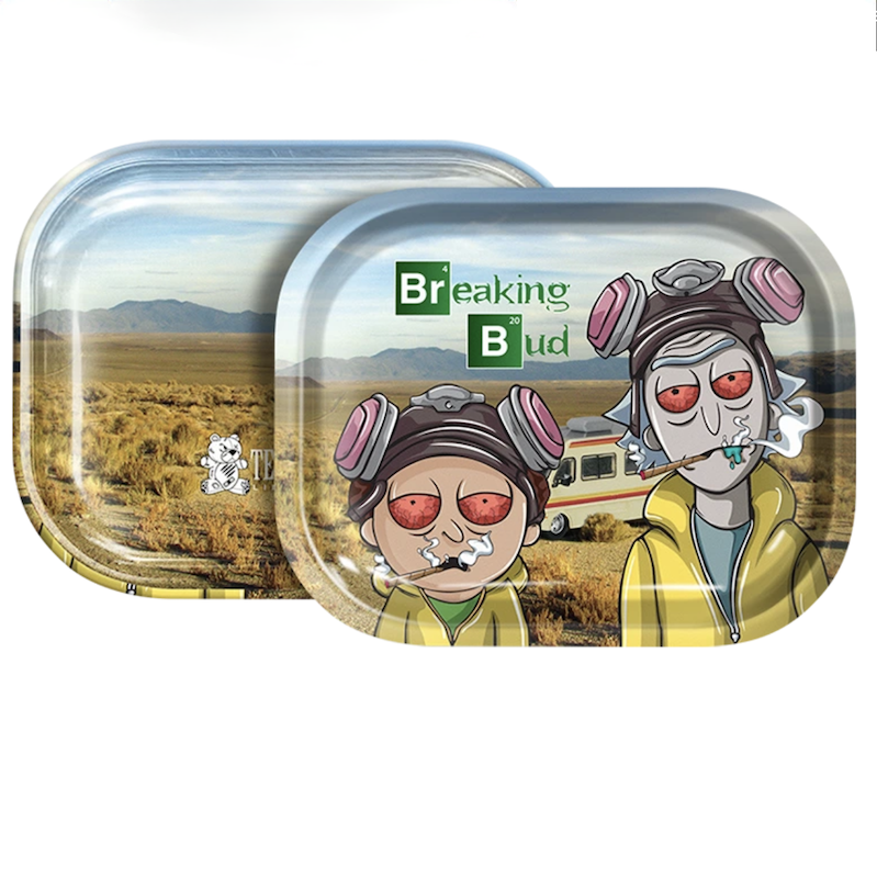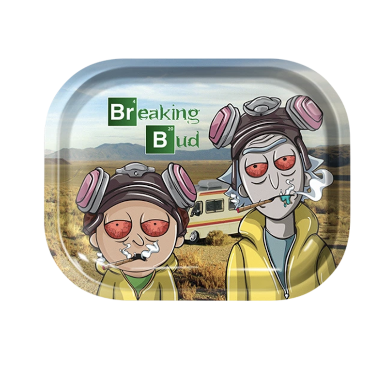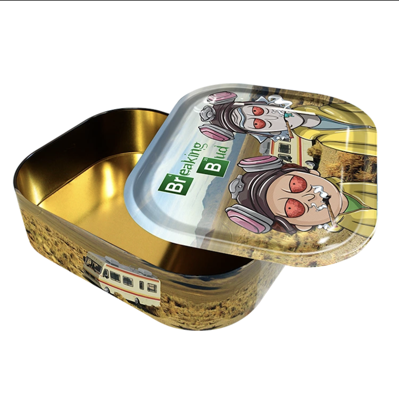 Mais ce qui fait vraiment le charme de cette boîte, c’est son design à couper le souffle ! Inspirée de la série culte *Rick et Morty*, on y retrouve nos deux compères en plein délire, parodiant *Breaking Bad* sous le nom hilarant de *Breaking BUD*. Imaginez Rick et Morty avec leurs masques à gaz relevés, les yeux éclatés, en train de profiter d’un moment de détente. À l’arrière-plan, le mythique camping-car des héros s’invite dans le décor.