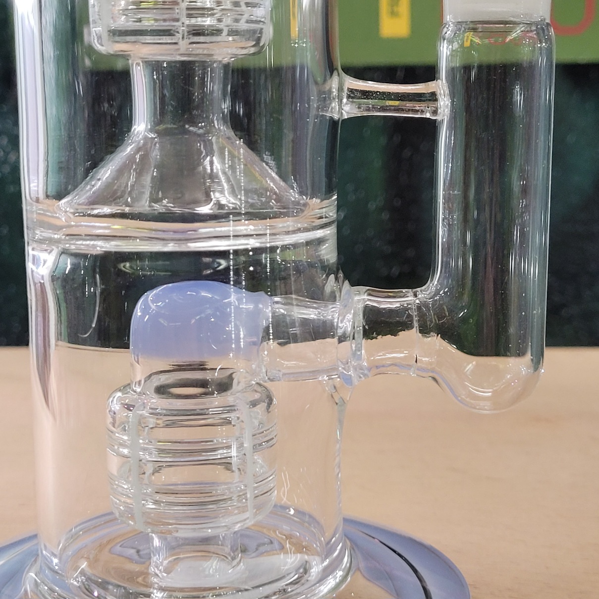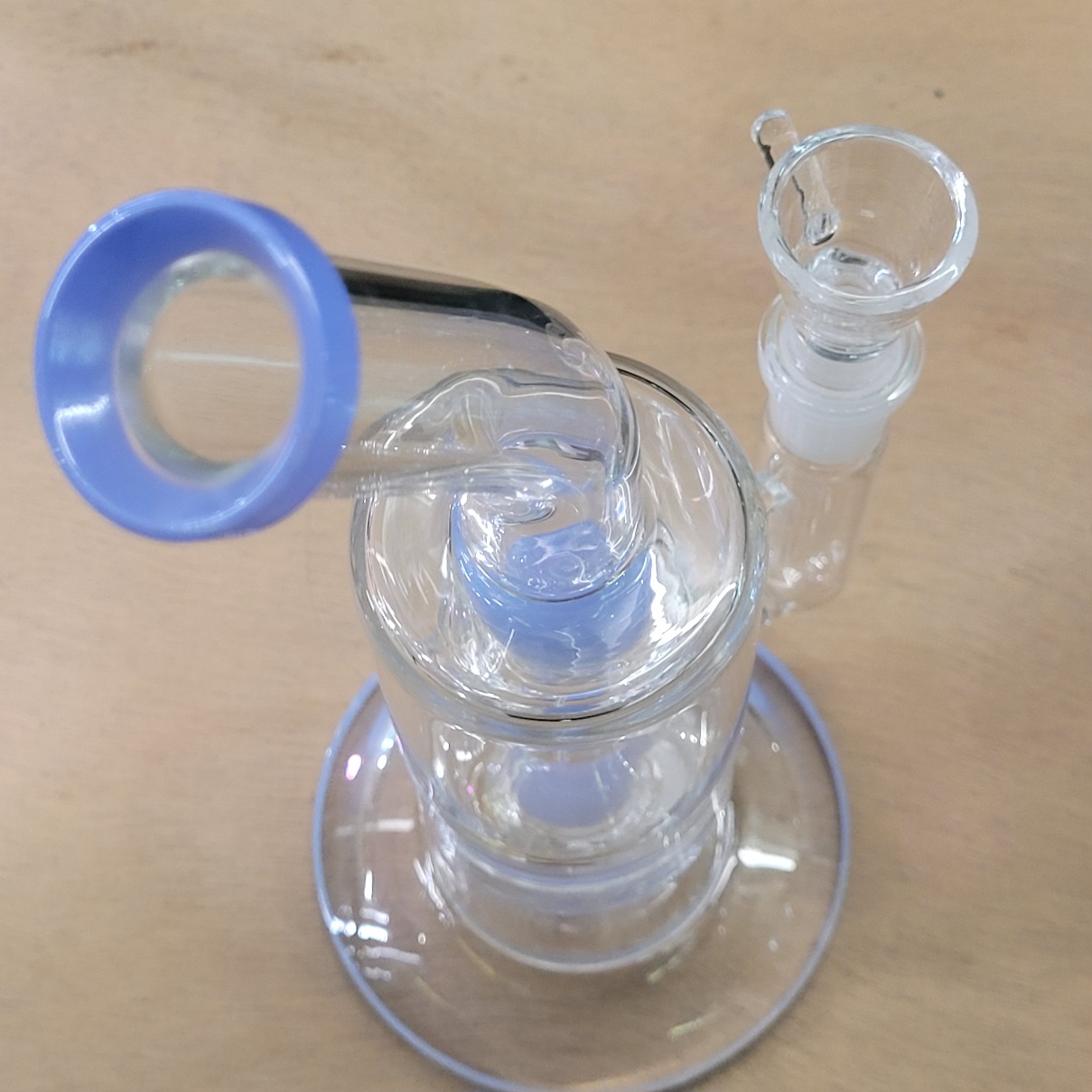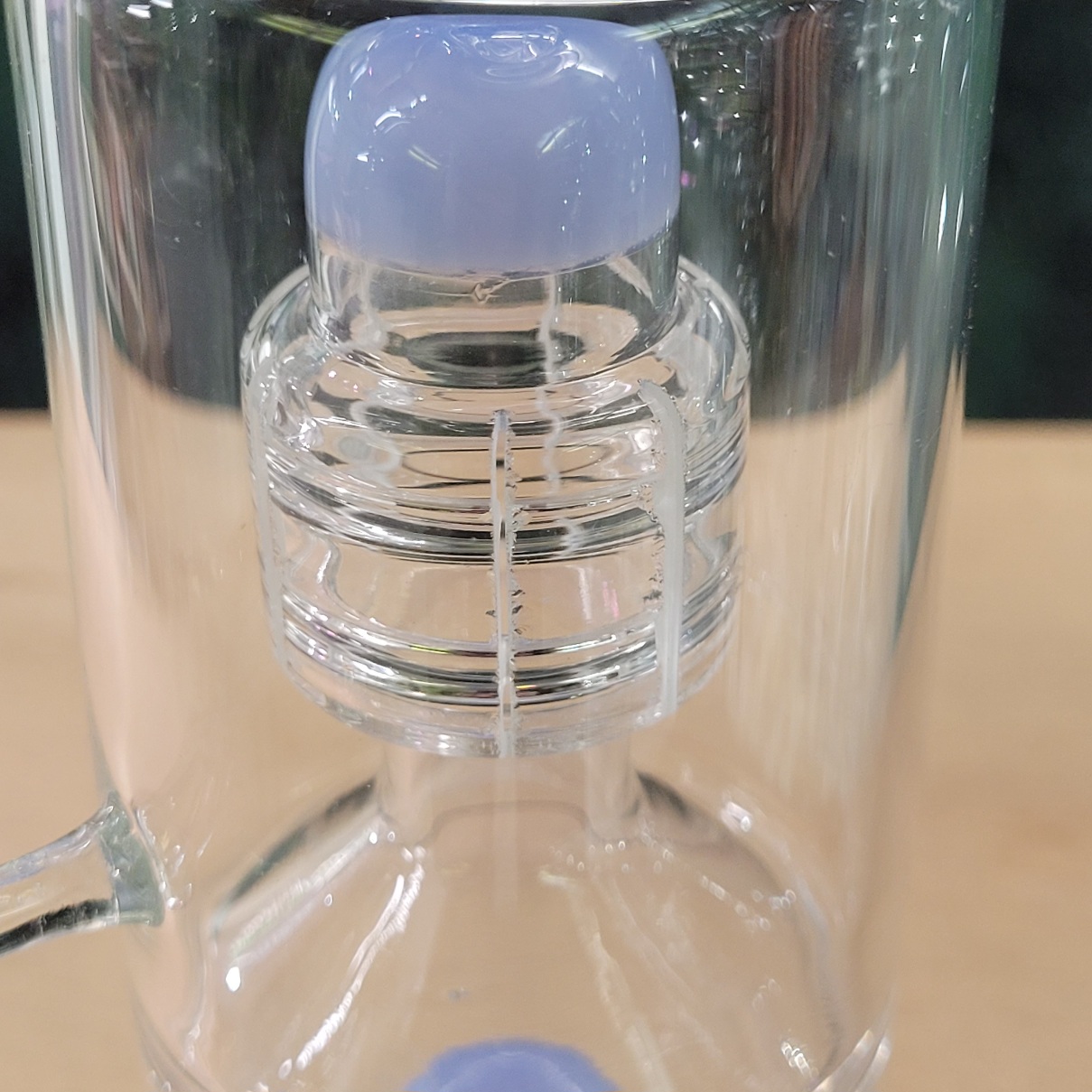 Une très belle pièce que ce bong avec deux percolateur pour une fumée très douce. En verre, avec un surlignage bleu sur l’embouchure et la base, d’une taille de 30 cm.