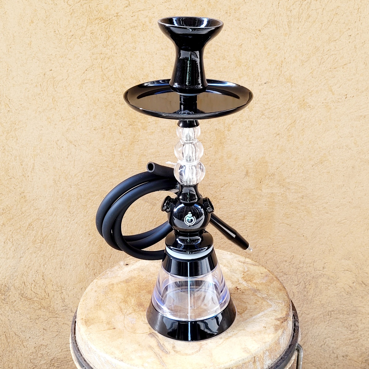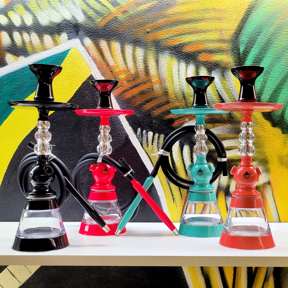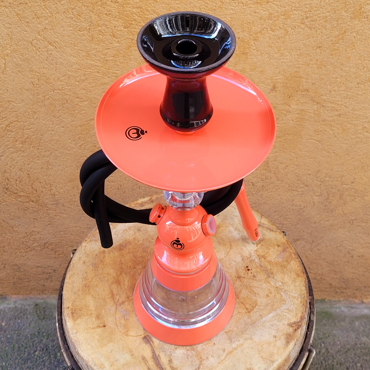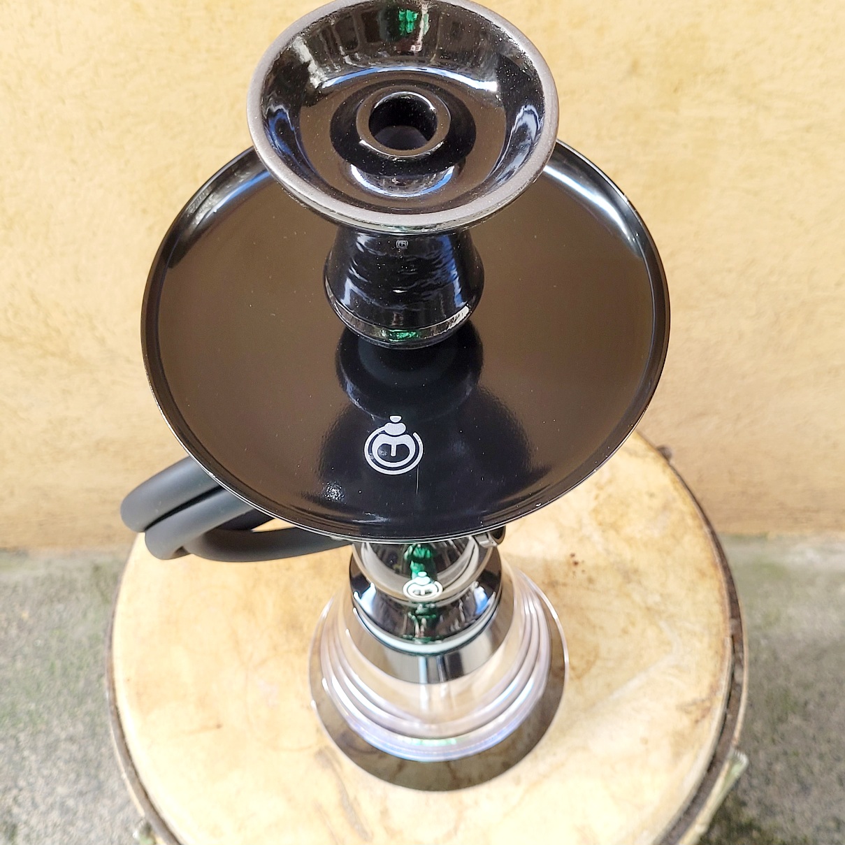 En plus de leur taille idéale, – 40 cm avec le foyer- ces chichas se distinguent par leur légèreté. Foyer en céramique, corps et cendrier en métal, et vase conique en acrylique. Tuyau silicone noir et manche en métal de la couleur de la chicha.