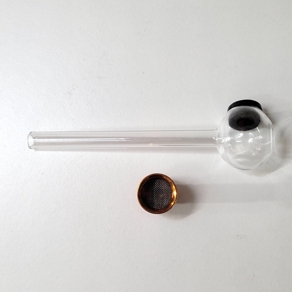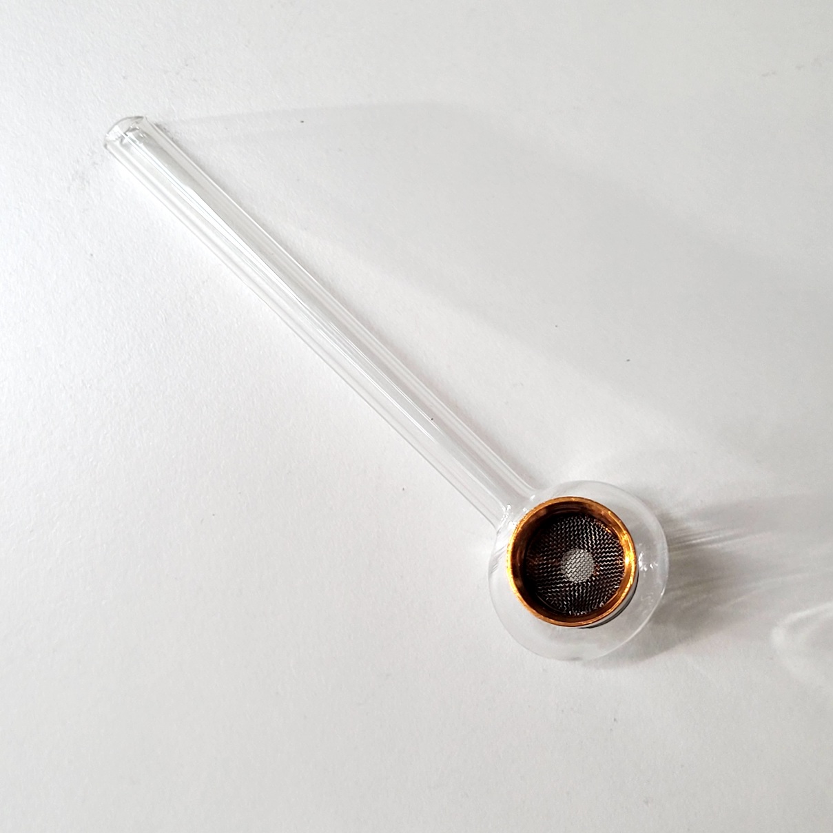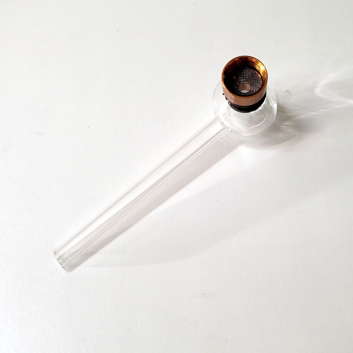 Pipe en verre avec boule, foyer en métal doré, muni d’une grille 12cm à peu près.