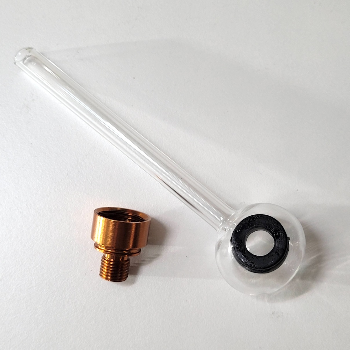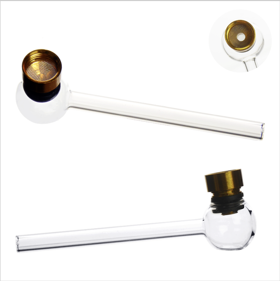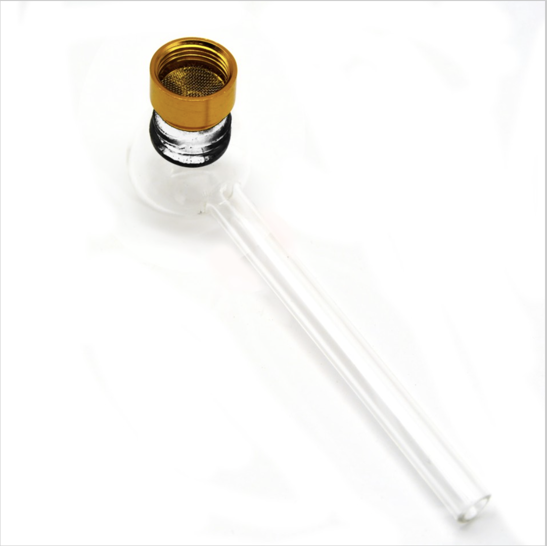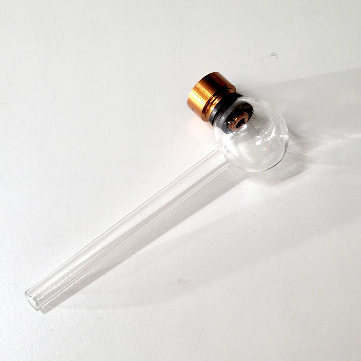 Pipe en verre avec boule, foyer en métal doré, muni d’une grille 12cm à peu près.