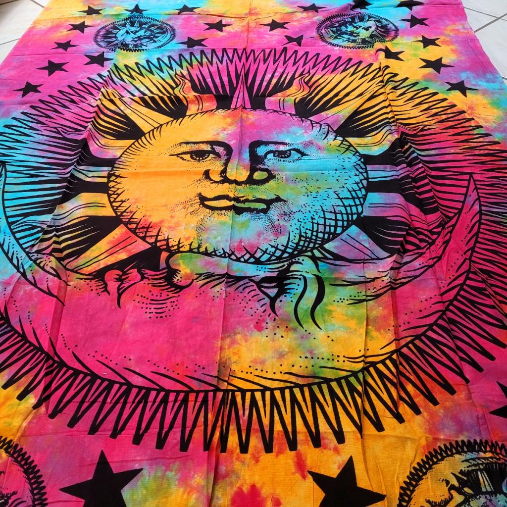 La tenture représente une grande composition cosmique où un soleil rayonnant et une lune se chevauchent au centre, entourés d’étoiles et de petits astres noirs qui ponctuent le fond. L’ensemble est imprimé sur un tissu coloré d’inspiration psychédélique, mêlant des teintes vives comme le rose, le bleu et le jaune, ce qui donne un effet très dynamisant et décoratif. Ce type de tenture murale, est destiné à décorer un mur, un espace de vie ou un coin bohème avec une ambiance céleste et harmonieuse entre le jour et la nuit.